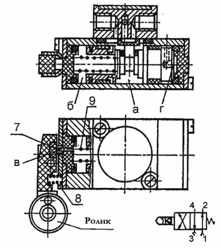 В пневмораспределителе В79-11А при воздействии на ролик открывается клапан 7, сжатый воздух из полости управления «б» (со стороны рычага) через сопло «в» сбрасывается в атмосферу, а распределительное устройство перемещается из одного крайнего положения в другое (левое). После прекращения механического воздействия на ролик, клапан 7 под воздействием пружины 8 (под рычагом) закрывается, происходит выравнивание давлений в полостях «а», «б» и «г» пневмораспределителя, а распределительное устройство под действием пружины 9 возвращается в исходное положение (правое).